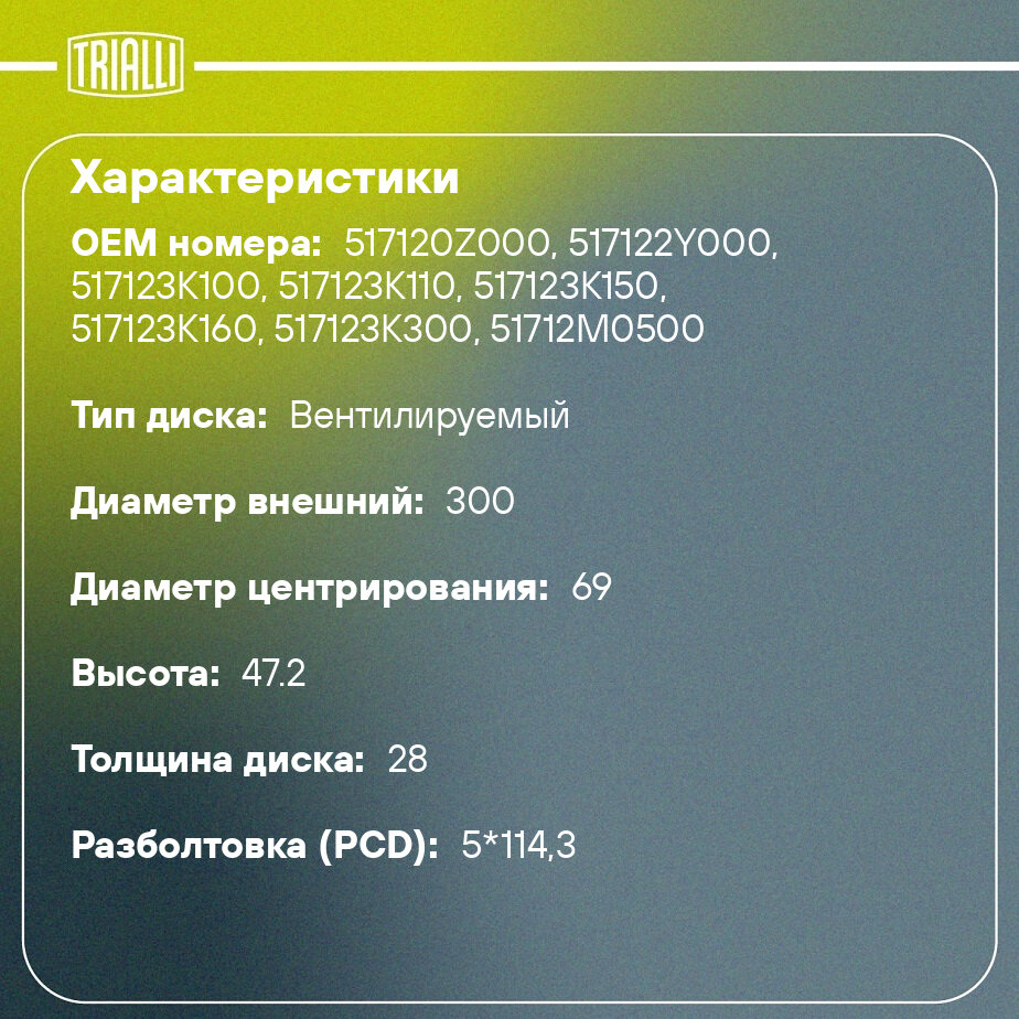 Бренд TRIALLI предлагает тормозные компоненты, соответствующие международным стандартам качества. Продукция проходит проверку на соответствие техническим требованиям и тестированиям на износостойкость, термостойкость и геометрическую точность. Тормозные диски производятся с соблюдением технологических норм, что обеспечивает их надёжную работу в различных условиях эксплуатации.
