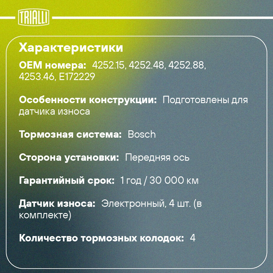 Колодки тормозные дисковые PF 4200 TRIALLI для Citroen C5 2.0i 16V/2.0HDi 00˃ — это надёжное решение для эффективного и безопасного торможения в любых дорожных условиях. Предназначены для замены изношенных тормозных колодок, обеспечивают стабильное прижатие к тормозному диску, минимизируя риск проскальзывания и сокращая тормозной путь. Основные преимущества тормозных дисковых колодок TRIALLI: Высокая износостойкость — увеличенный срок службы за счёт применения современных фрикционных материалов. Стабильная работа при перепадах температур — эффективное торможение как в городском цикле, так и на трассе. Низкий уровень шума и вибраций — специальное покрытие и демпфирующие пластины обеспечивают тихую и плавную работу. Минимальное образование пыли — сохраняет чистоту дисков. Быстрое приработочное торможение — достигается эффективное сцепление уже с первых километров после установки. Продукция TRIALLI разрабатывается с учётом международных стандартов безопасности и проходит многоэтапный контроль качества на всех стадиях производства. При производстве используются передовые технологии, что позволяет обеспечивать стабильные эксплуатационные характеристики даже в сложных климатических условиях. Для достижения максимальной эффективности рекомендуется заменять тормозные колодки TRIALLI парами на одной оси. Перед установкой убедитесь в отсутствии повреждений на тормозных дисках и при необходимости выполните их шлифовку или замену. После монтажа новых колодок соблюдайте режим приработки: избегайте резких торможений в первые 200–300 км, чтобы обеспечить равномерное прилегание фрикционного материала к диску. Регулярно проверяйте уровень тормозной жидкости и состояние направляющих суппортов для предотвращения закисания и неравномерного износа.