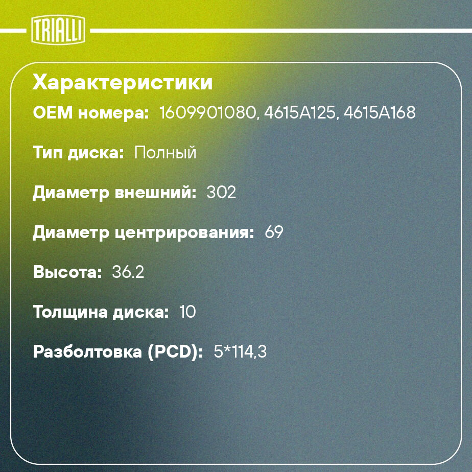 Тормозные диски TRIALLI DF 117304 для Citroen C4 Aircross 1.6 10-/Mitsubishi Asx 1.6 Di-D 09- обеспечивают эффективное торможение за счёт стабильного контакта с колодками. Разработаны для обеспечения надежного, стабильного и безопасного торможения в различных дорожных условиях.