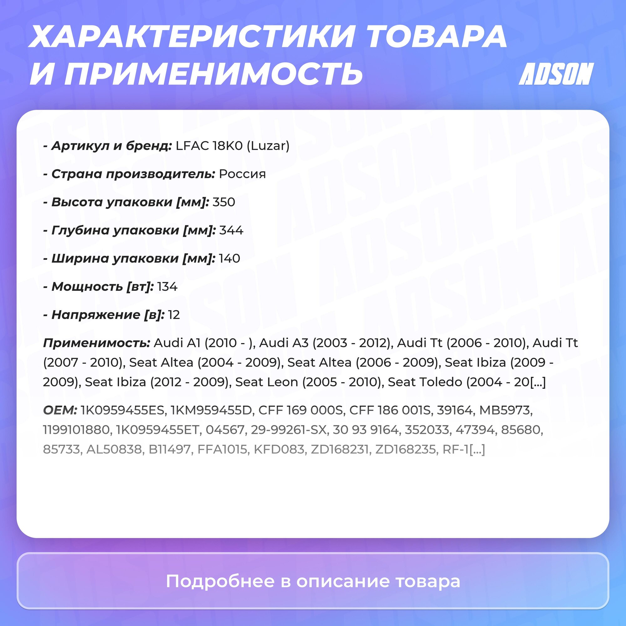 Электровентилятор кондиционера для автомобилей Octavia A5 (04-)/Golf V (03-) (без кожуха) LUZAR LFAC 18K0