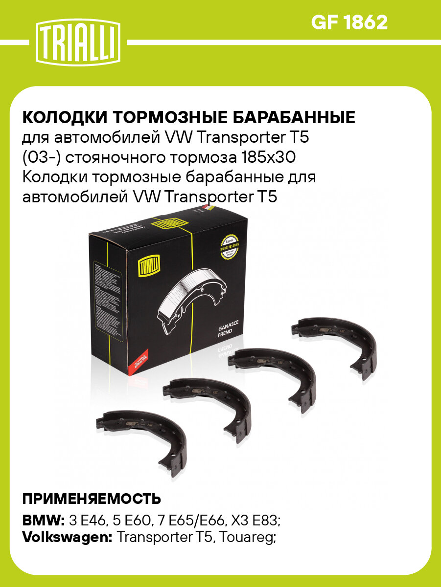 Колодки тормозные барабанные для автомобилей VW Transporter T5 (03-) стояночного тормоза 185x30 TRIALLI (GF 1862)