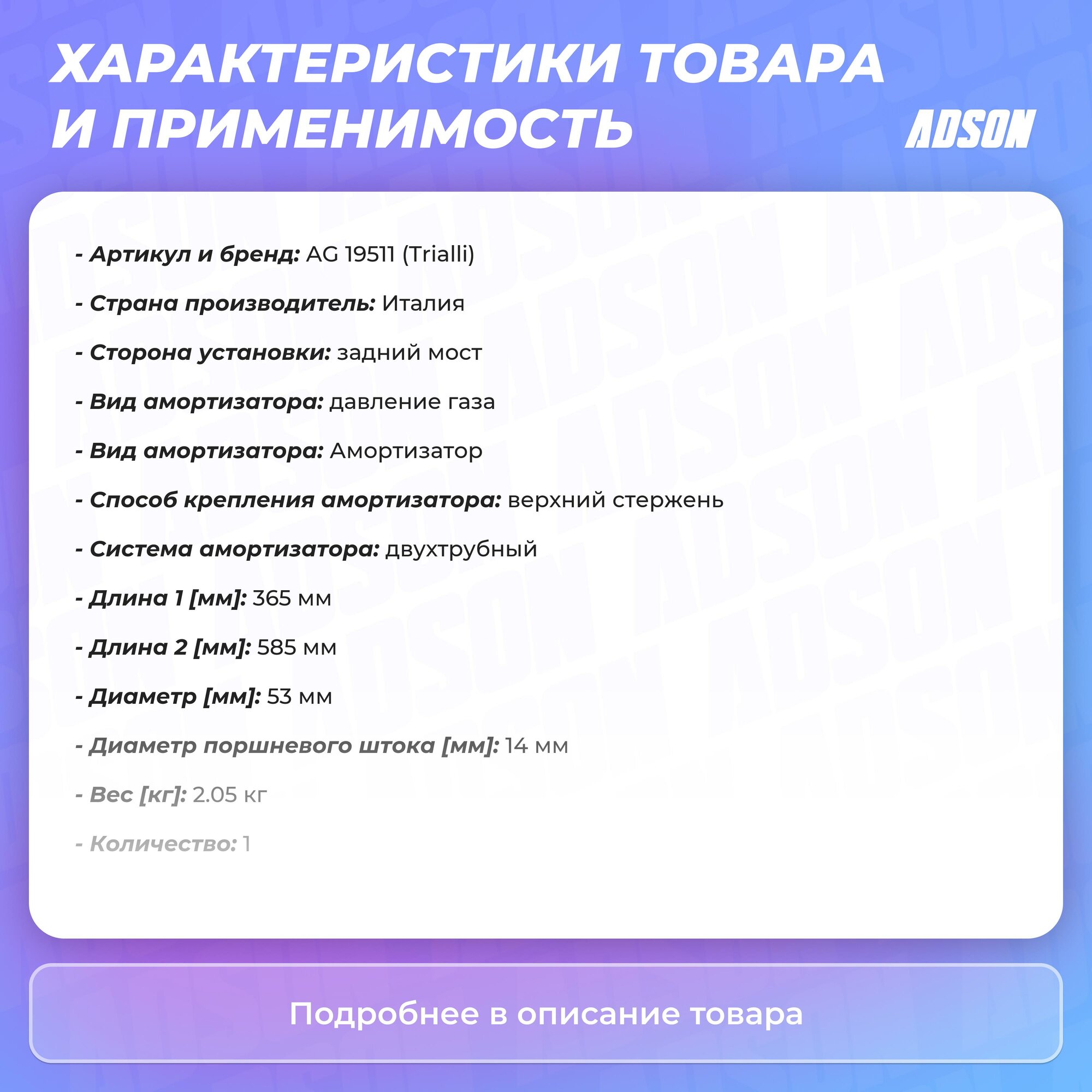 | Сопутствующий товар | Амортизаторы:AG 19010 |