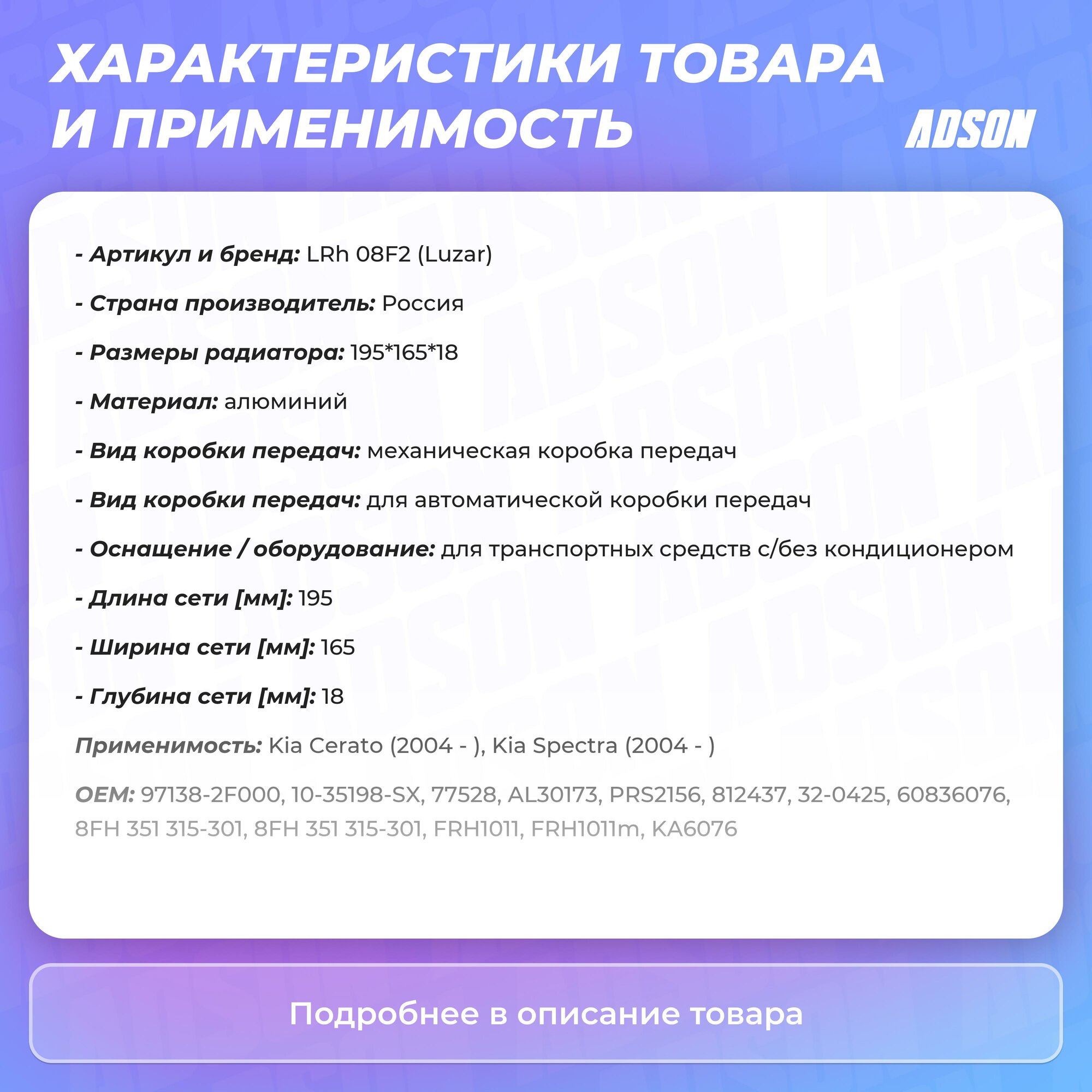 Внимание ! Цена указывается за 1 единицу товара!Вы Смотрите :Номер товара : LRH08F2 Производитель : LUZAR Название товара : Радиатор отопителя Kia Cerato 04- Luzar Доступно для заказа : 4 Минимальное количество для заказа : 1 - заказывать кратно данному числу !Внимание!Делаем отправку заказа максимум через 2 дня после заказа, в зависимости от дня недели.Цена указана за 1шт, если указывается кол-во в лоте 10, то нужно заказывать 10шт, по 1шт данный товар не отправляемНапример:Cвечи продаются по 4шт(6,8,12) минимум и кратно 4шт(6,8,12)Втулки стабилизатора (которые одинаковые) по 2шт минимум и кратно 2шт, за исключением когда втулка идет на одну из сторон, то есть правая или левая!Пружины продаются по 2шт!