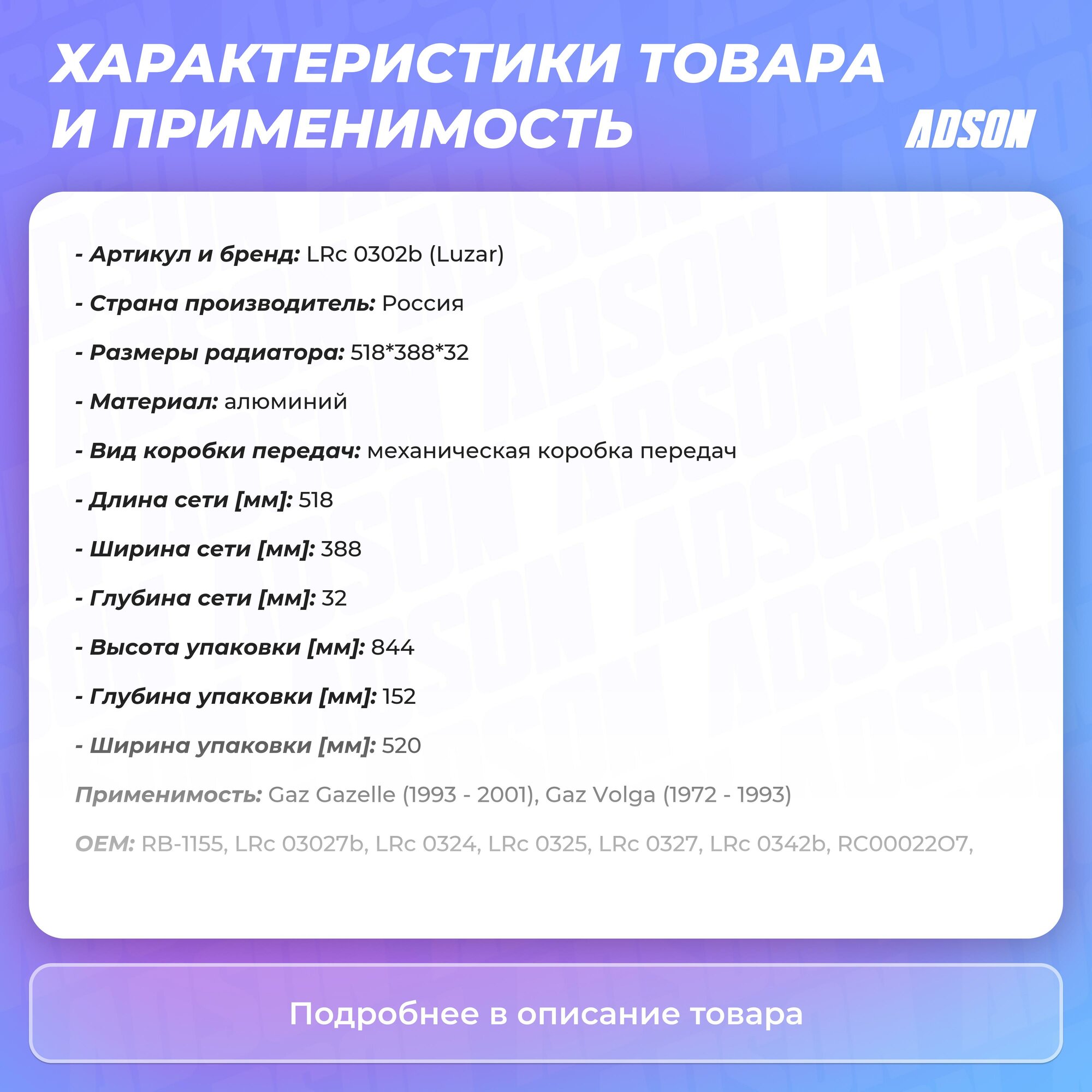 На сегодняшний день товар «Радиатор охлаждения для автомобилей ГАЗ 3302 ГАЗель (-99) (алюм. паяный) LUZAR (LRc 0302b)» можно купить с кешбеком в 1 магазине: Яндекс.Маркет