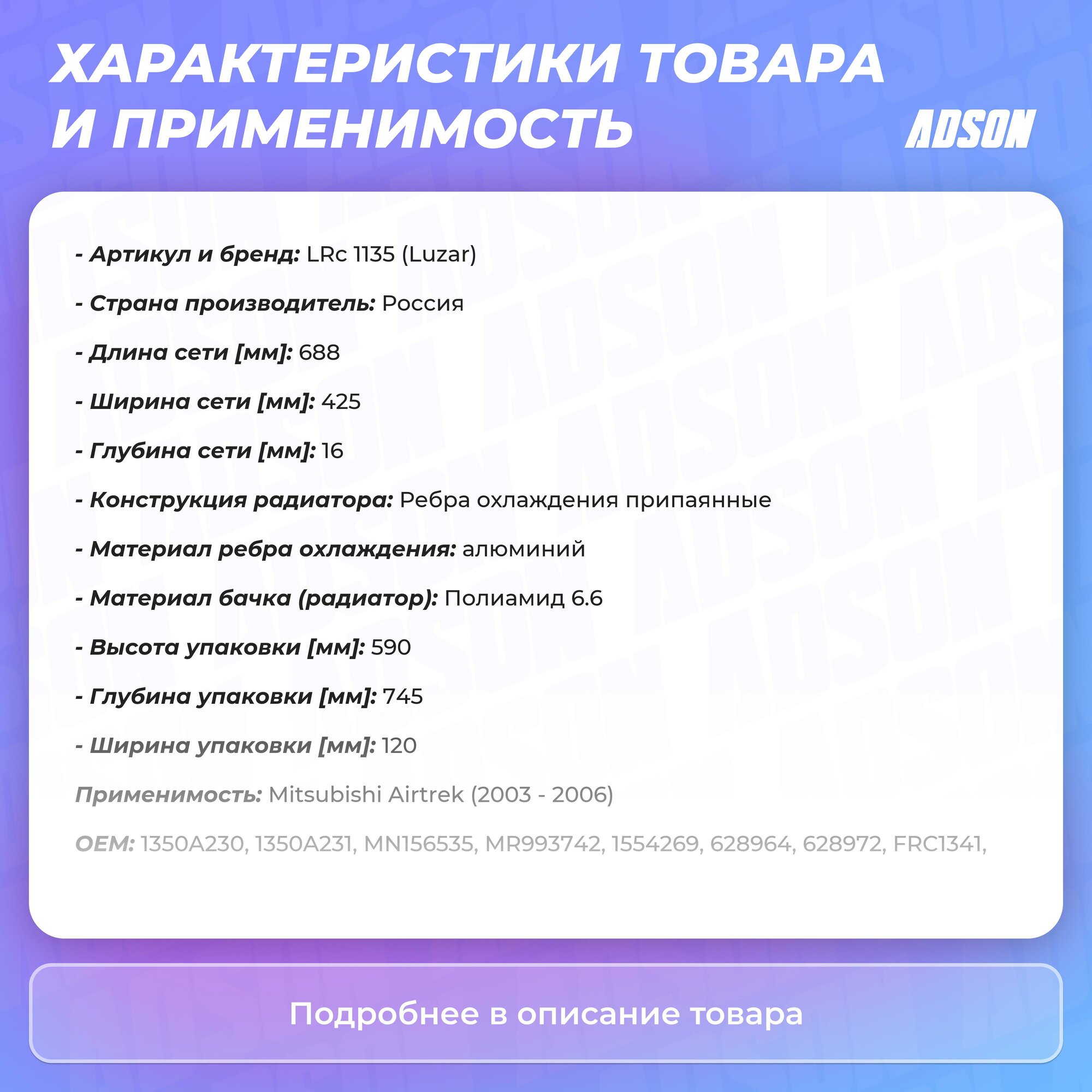 На сегодняшний день товар «Радиатор охлаждения для автомобилей Outlander (03-) MT LUZAR (LRc 1135)» можно купить с кешбеком в 1 магазине: Яндекс.Маркет