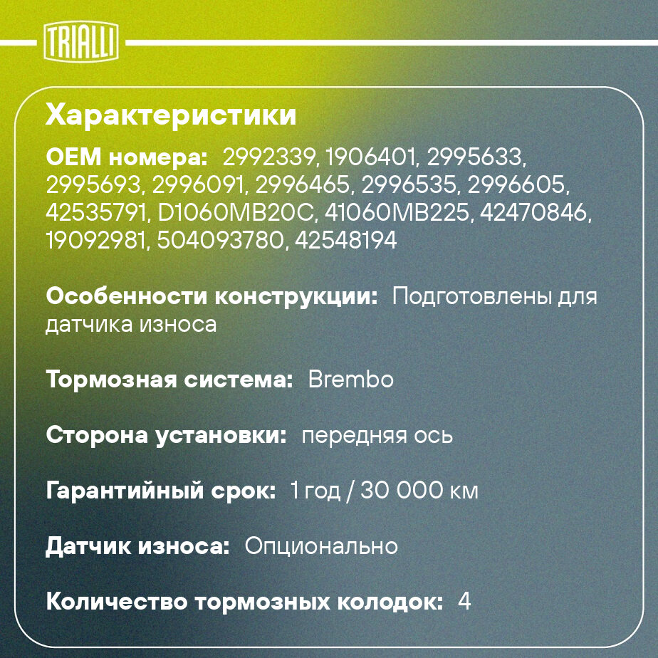 Колодки тормозные дисковые PF 1601 TRIALLI для Omn Iveco Daily C/S-серия,RVI Mascott — это надёжное решение для эффективного и безопасного торможения в любых дорожных условиях. Предназначены для замены изношенных тормозных колодок, обеспечивают стабильное прижатие к тормозному диску, минимизируя риск проскальзывания и сокращая тормозной путь. Основные преимущества тормозных дисковых колодок TRIALLI: Высокая износостойкость — увеличенный срок службы за счёт применения современных фрикционных материалов. Стабильная работа при перепадах температур — эффективное торможение как в городском цикле, так и на трассе. Низкий уровень шума и вибраций — специальное покрытие и демпфирующие пластины обеспечивают тихую и плавную работу. Минимальное образование пыли — сохраняет чистоту дисков. Быстрое приработочное торможение — достигается эффективное сцепление уже с первых километров после установки. Продукция TRIALLI разрабатывается с учётом международных стандартов безопасности и проходит многоэтапный контроль качества на всех стадиях производства. При производстве используются передовые технологии, что позволяет обеспечивать стабильные эксплуатационные характеристики даже в сложных климатических условиях. Для достижения максимальной эффективности рекомендуется заменять тормозные колодки TRIALLI парами на одной оси. Перед установкой убедитесь в отсутствии повреждений на тормозных дисках и при необходимости выполните их шлифовку или замену. После монтажа новых колодок соблюдайте режим приработки: избегайте резких торможений в первые 200–300 км, чтобы обеспечить равномерное прилегание фрикционного материала к диску. Регулярно проверяйте уровень тормозной жидкости и состояние направляющих суппортов для предотвращения закисания и неравномерного износа.