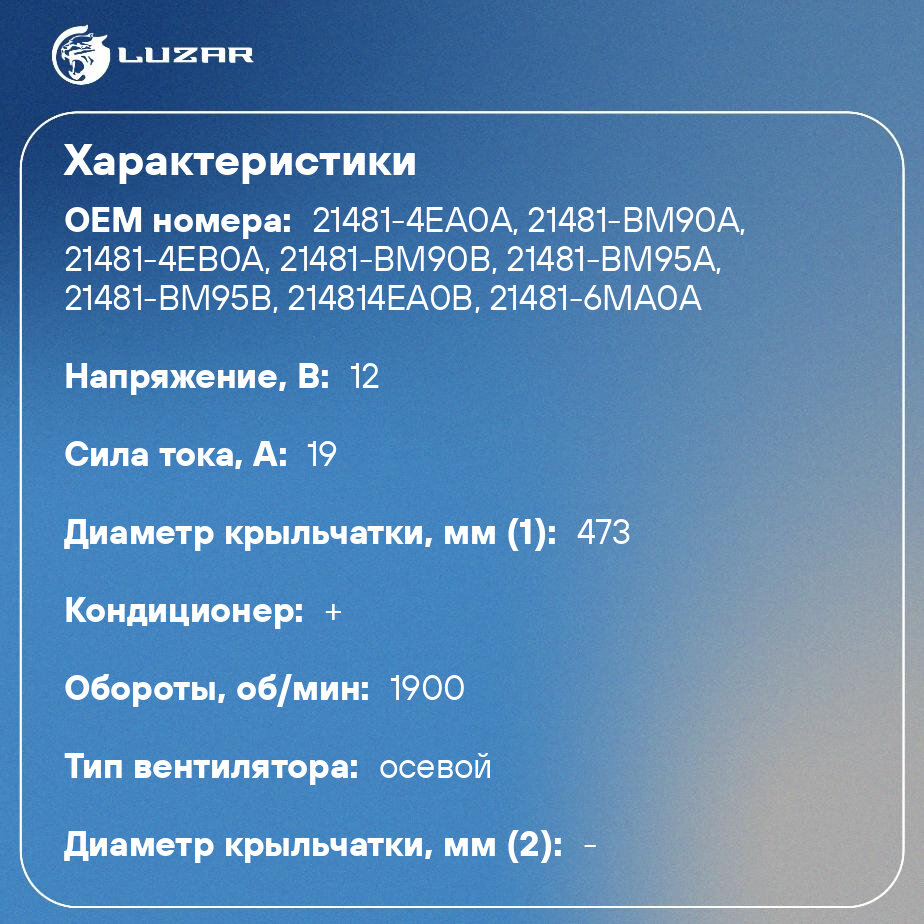 Электровентиляторы охлаждения LUZAR – это электродвигатель в сборе с крыльчаткой, который обеспечивает циркуляцию потока воздуха сквозь радиатор охлаждения, что обеспечивает лучший отвод тепла от охлаждающей жидкости внутри радиатора. Поток воздуха направляется вдоль оси двигателя. Производимые вентиляторы охлаждения соответствуют требованиям нормативам заводов-изготовителей по аэродинамическим свойствам и техническим параметрам.