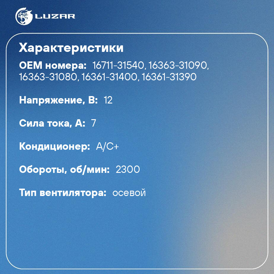 Электровентиляторы охлаждения LUZAR – это электродвигатель в сборе с крыльчаткой, который обеспечивает циркуляцию потока воздуха сквозь радиатор охлаждения, что обеспечивает лучший отвод тепла от охлаждающей жидкости внутри радиатора. Поток воздуха направляется вдоль оси двигателя. Производимые вентиляторы охлаждения соответствуют требованиям нормативам заводов-изготовителей по аэродинамическим свойствам и техническим параметрам.