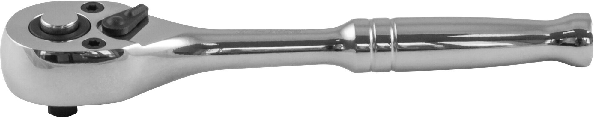 Рукоятка трещоточная 1/4"DR, 36 зубцов, 125 мм Jonnesway с флажковым переключателем и металлической ручкой, выполненной в стиле snap-on. Зеркальное хромоникелевое покрытие. Несколько короче и легче рукояток серии r06. Средний 10град. обратный ход, сдвоенный храповик. Устройство быстрого сброса надежно фиксирует насадку на приводе и легко от нее освобождается одним нажатием на кнопку.
