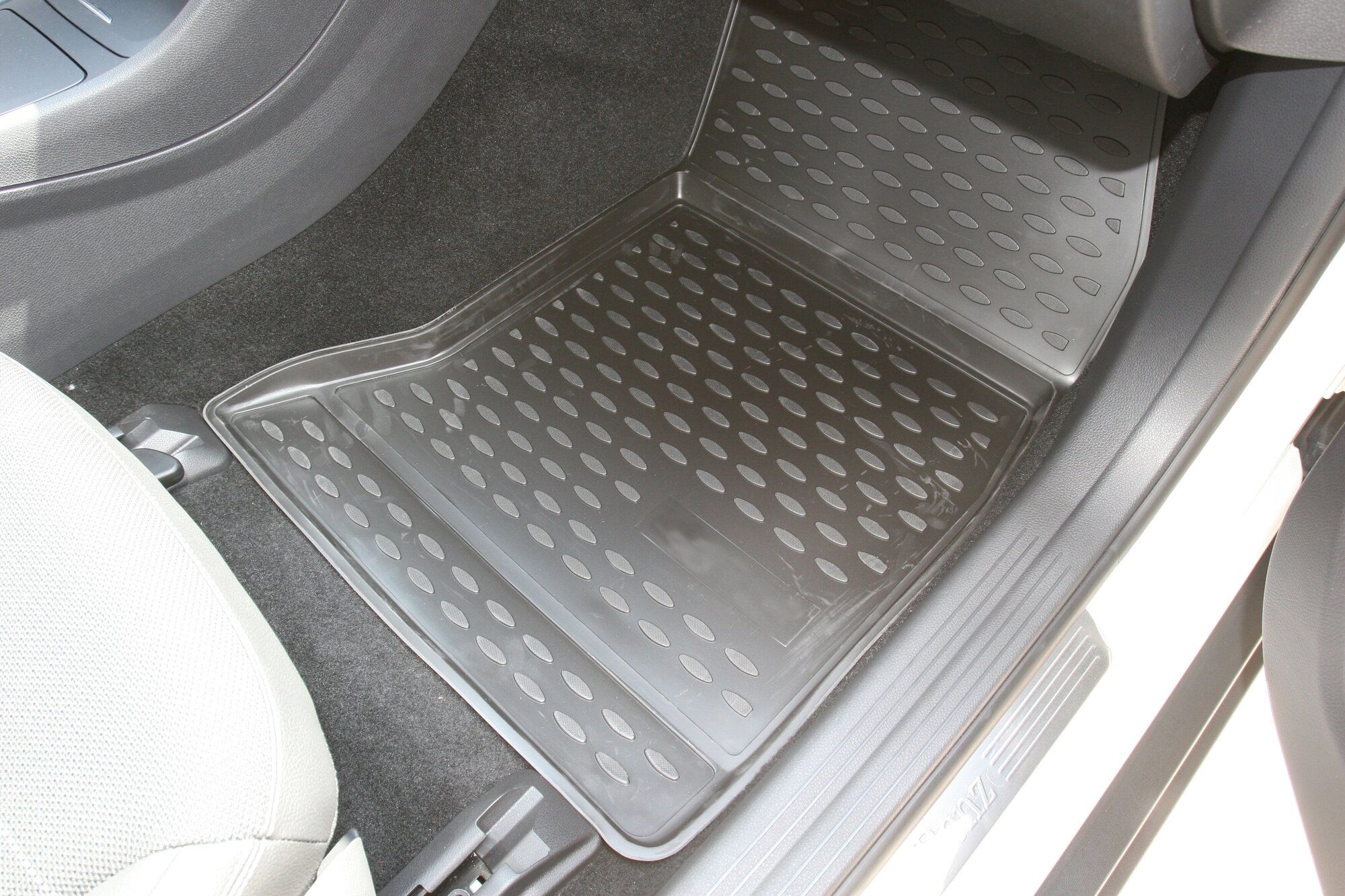 Коврики в салон из полиуретана обретают всё большую популярность, вытесняя резиновые изделия, так как этот материал имеет ряд преимуществ: меньший вес при одинаковой площади ковра, высокую эластичность, меньший коэффициент износа при схожих условиях эксплуатации – при этом у полимера полностью отсутствует запах, этот материал не выделяет едких испарений. Для салона каждой модели авто коврики изготавливаются по индивидуальным кроям, что обеспечивает максимальное прилегание изделия в нише пола без зазоров и складок. Для защиты напольного покрытия в геометрии ковра предусмотрены высокие бортики и рельефный рисунок – всё это способствует удержанию как песка, так и влаги. Коврик водителя дополнительно оборудован выступом – язычком, закрывающим подножку рядом с педалью сцепления, а также рельефом антискольжения и фиксаторами. Полиуретановые коврики просты в эксплуатации и чистке. Изделия выпускаются в сером, бежевом и чёрном цвете – это позволит выбрать подходящий для любого интерьера автомобиля. Продукция прошла сертификацию, что подтверждает её качество.