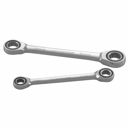 Прямой двусторонний накидной гаечный ключ, сочетающий две сопредельные по размерам рабочие части, снабженные храповыми механизмами с колесом в 72 зубца со свободным ходом в 5град., что обеспечивает удобство при работе в ограниченном пространстве. Ключ изготовлен по стандарту ANSI, имеет трехслойное хромоникелевое покрытие и зеркально отполирован.
