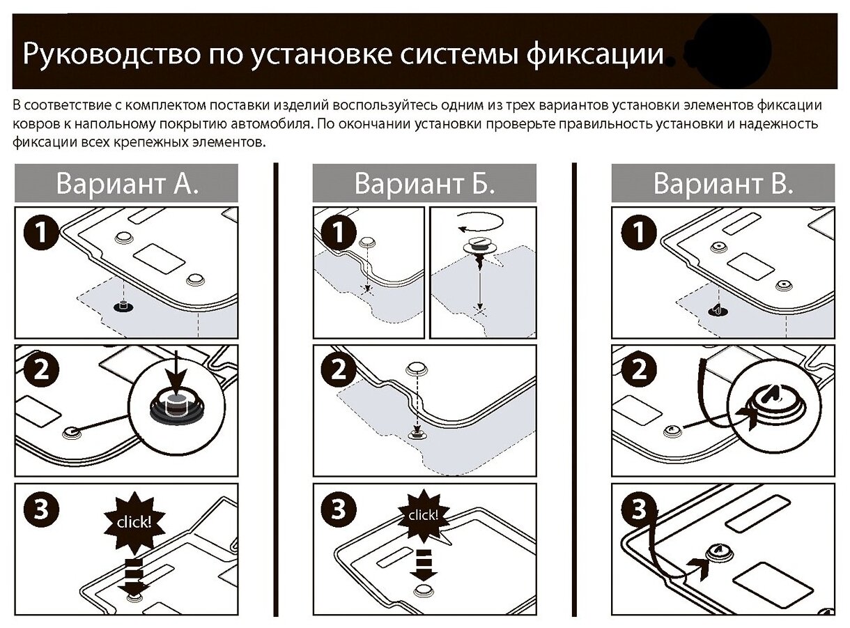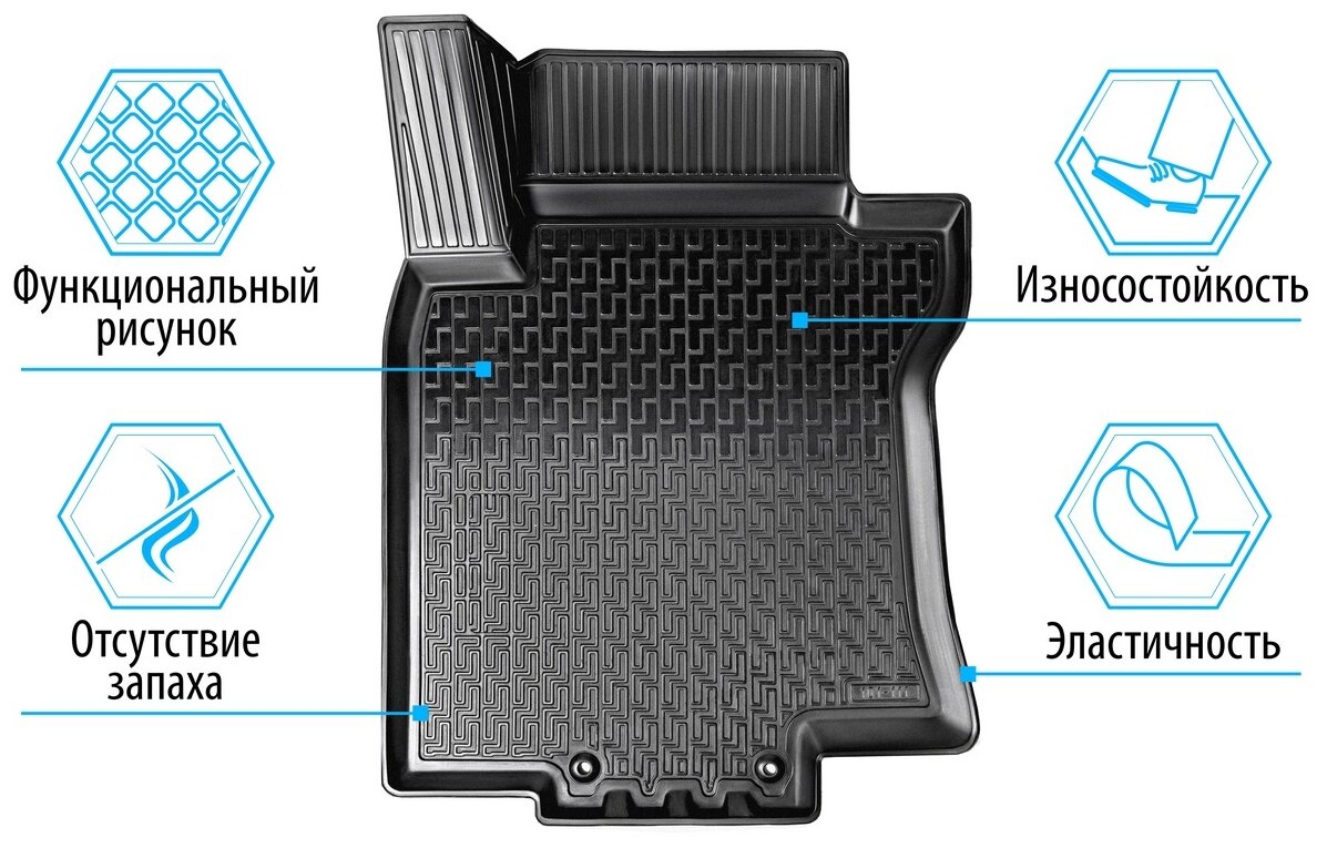 - Надежная система крепления, позволяющая закрепить коврик на штатные элементы фиксации, в результате чего отсутствует эффект скольжения по салону автомобиля.