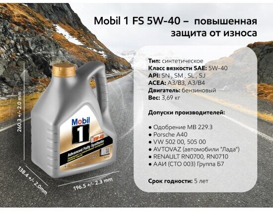 Mobil 1 FS 5W-40 производится на основе синтетических базовых масел высокого уровня свойств и тщательно сбалансированного пакета присадок, что обеспечивает: