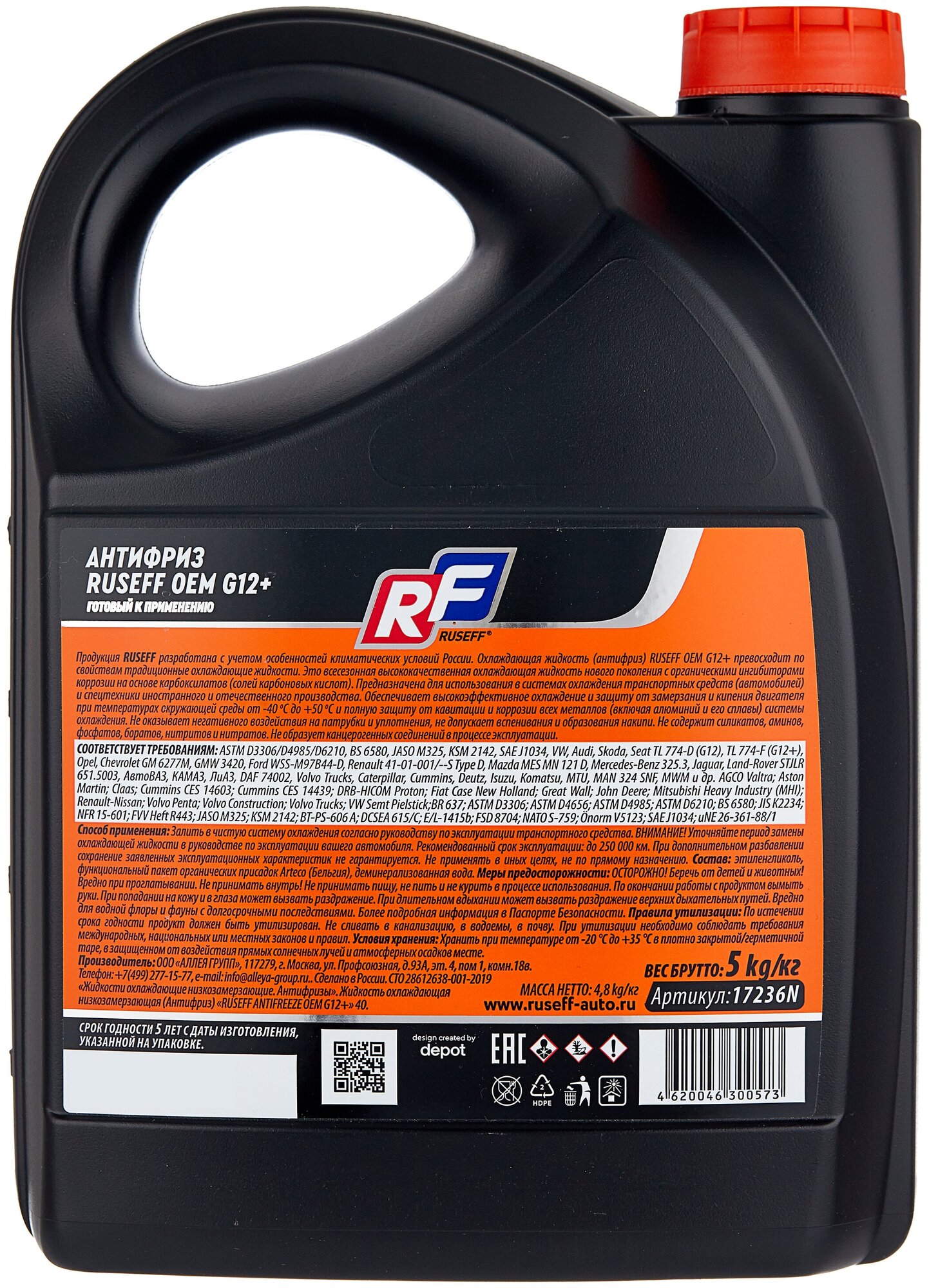 Антифриз ОЕМ G12+ RUSEFF – высококачественный отечественный продукт, превосходящий по свойствам традиционные охлаждающие жидкости. Это готовая к применению всесезонная охлаждающая жидкость нового поколения с органическими ингибиторами коррозии на основе карбоксилатов, предназначенная для использования в системах охлаждения двигателей внутреннего сгорания.