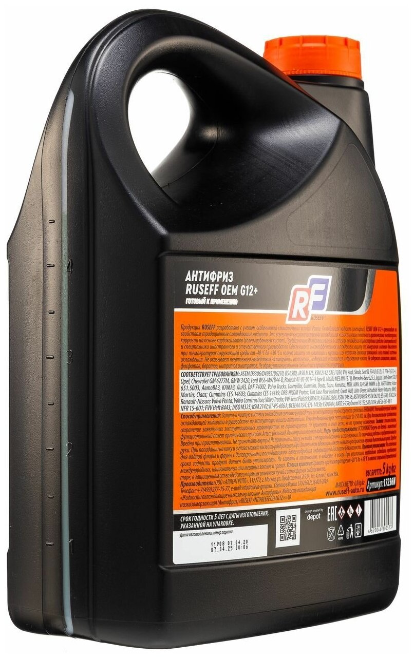 Антифриз ОЕМ G12+ RUSEFF имеет следующие допуски и соответствия: AUDI, VW, SKODA, SEAT TL 774-D (G12), TL 774-F (G12+); FORD WSS-M97B44-D, JAGUAR, LAND ROVER STJLR 651 5003; OPEL, CHEVROLET GM 6277M, GMW 3420; RENAULT 41-01-001/--STYPE D; MERCEDES-BENZ 325.3; MAZDA MEZ MN 121D; LADA и др.