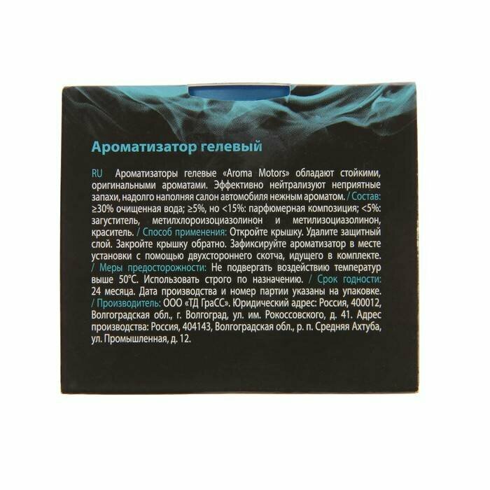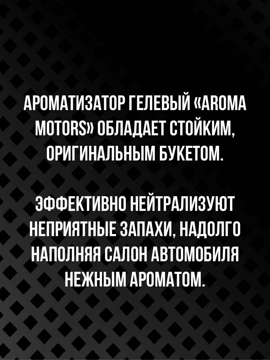 Ароматизатор гелевый «Aroma Motors» обладает стойким, оригинальным букетом. Эффективно нейтрализуют неприятные запахи, надолго наполняя салон автомобиля нежным ароматом.