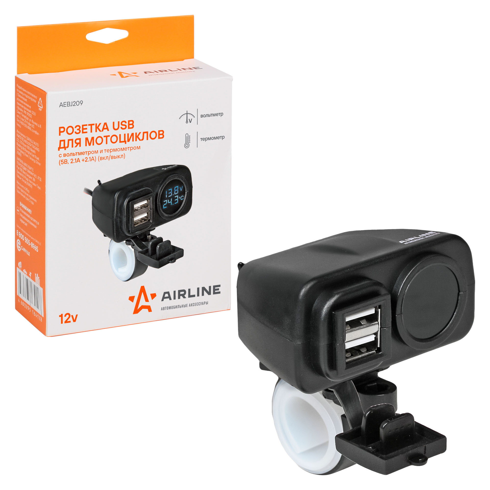 Розетка USB для мотоциклов AIRLINE с вольтметром и термометром 5В 2.1Аи2.1А вкл/выкл (AEBJ209)
