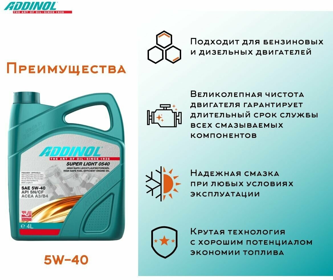 Моторные масла ADDINOL отличаются надежной защитой от износа и прекрасными качествами при пуске и прогреве двигателя, благодаря улучшенным низкотемпературным и антифрикционным свойствам. Такое масло обеспечит надежную защиту от износа и коррозии; пониженные вредные выбросы; стабильную смазочную пленку при любых условиях эксплуатации; улучшенные антифрикционные свойства, что обусловит низкий расход топлива; незначительный расход масла, благодаря меньшим потерям на испарение; превосходную защиту каталитического нейтрализатора и других систем нейтрализации отработавших газов