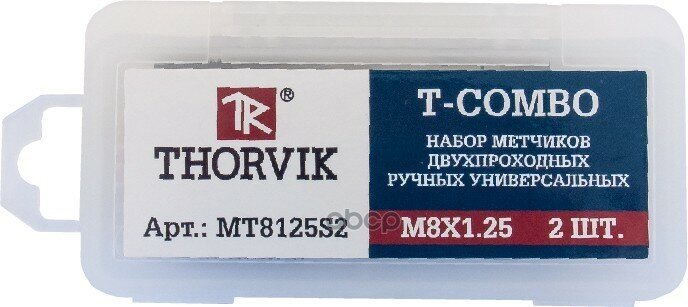 Набор метчиков T-COMBO двухпроходных ручных универсальных М8х1.25, HSS-G, 2 шт. Thorvik изготовлен из быстрорежущей стали 4341 (аналог 11Р3АМ3Ф2), которая применяется для изготовления инструмента простой формы, используемого при обработке углеродистых и малолегированных сталей с прочностью не более 784 МПа. Подходит для сквозных и глухих отверстий, тип получаемой резьбы M/MF, тип заборного конуса (A/C)