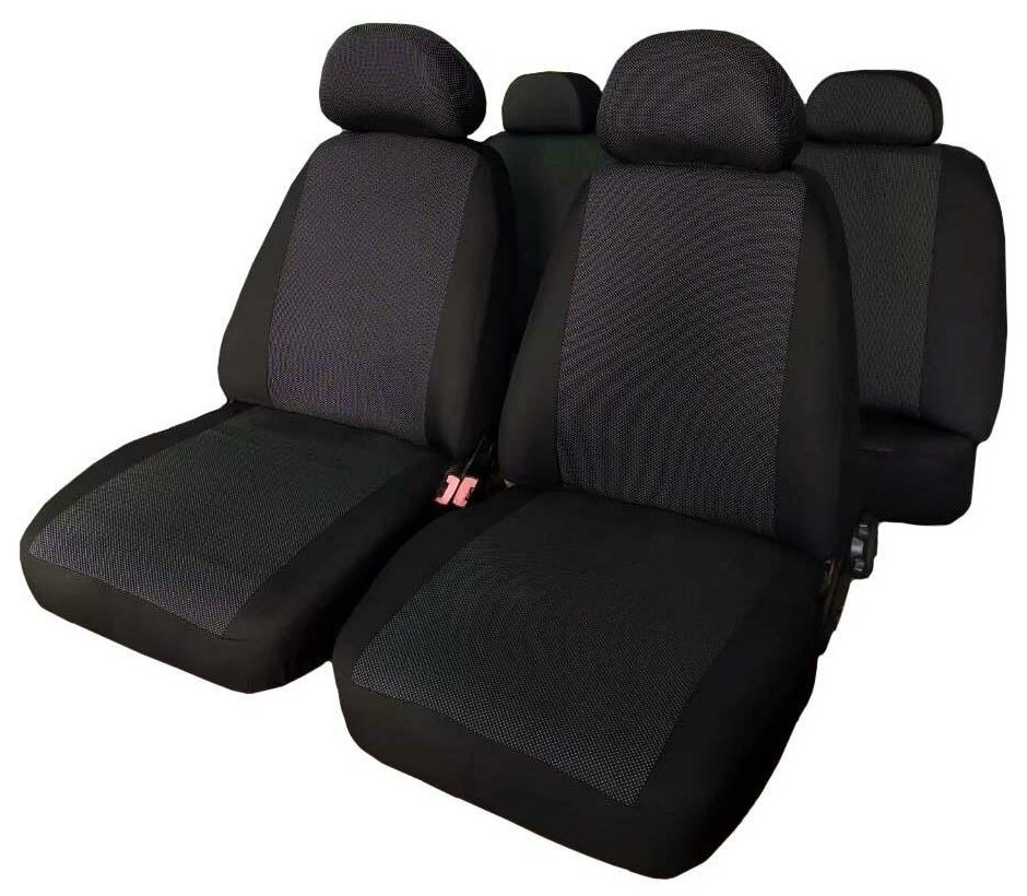 Чехлы изготовлены из автомобильного жаккарда черного цвета, который по своим свойствам идентичен штатному. В местах боковой поддержки - специализированная жаккардовая ткань "Компаньон". На спинках передних сидений находятся карманы на молнии. Передние чехлы имеют специальный крой, который не мешает открытию подушек безопасности.