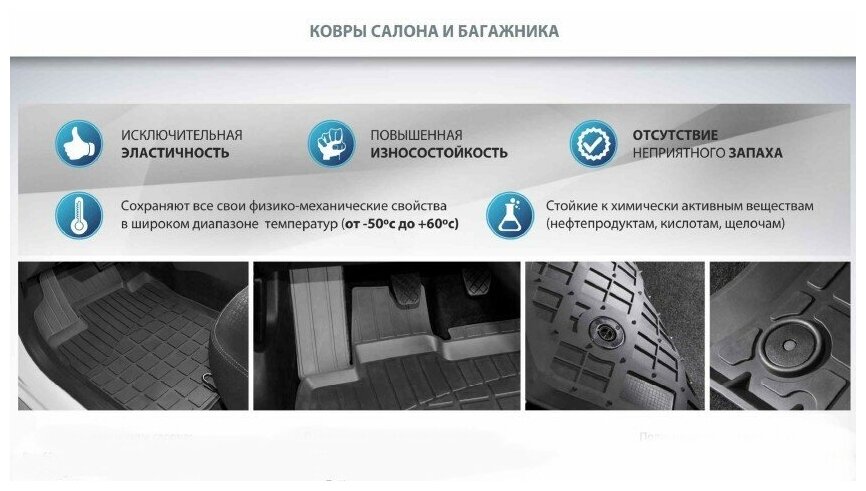 Коврик багажника позволяет надежно защитить и сохранить от грязи багажный отсек вашего автомобиля на протяжении всего срока эксплуатации, полностью повторяют геометрию багажника.Основными преимуществами продукта являются:- Борт, высотой 3 см, имеет специальную конструкцию, препятствующую попаданию разлившейся жидкости и грязи на внутреннюю отделку.- Произведены из первичных материалов, в результате чего отсутствует неприятный запах в салоне автомобиля.- Рисунок обеспечивает противоскользящую поверхность, благодаря которой перевозимые предметы не перекатываются в багажном отделении, а остаются на своих местах.- Высокая эластичность, можно беспрепятственно эксплуатировать при температуре от -50 до +60 градусов по Цельсию.- Изготовлены из высококачественного и экологичного материала, не подверженного воздействию кислот, щелочей и нефтепродуктов.Уважаемые клиенты! Обращаем ваше внимание, что коврики имеет форму соответствующую модели данного автомобиля. Фото служит для визуального восприятия товара.