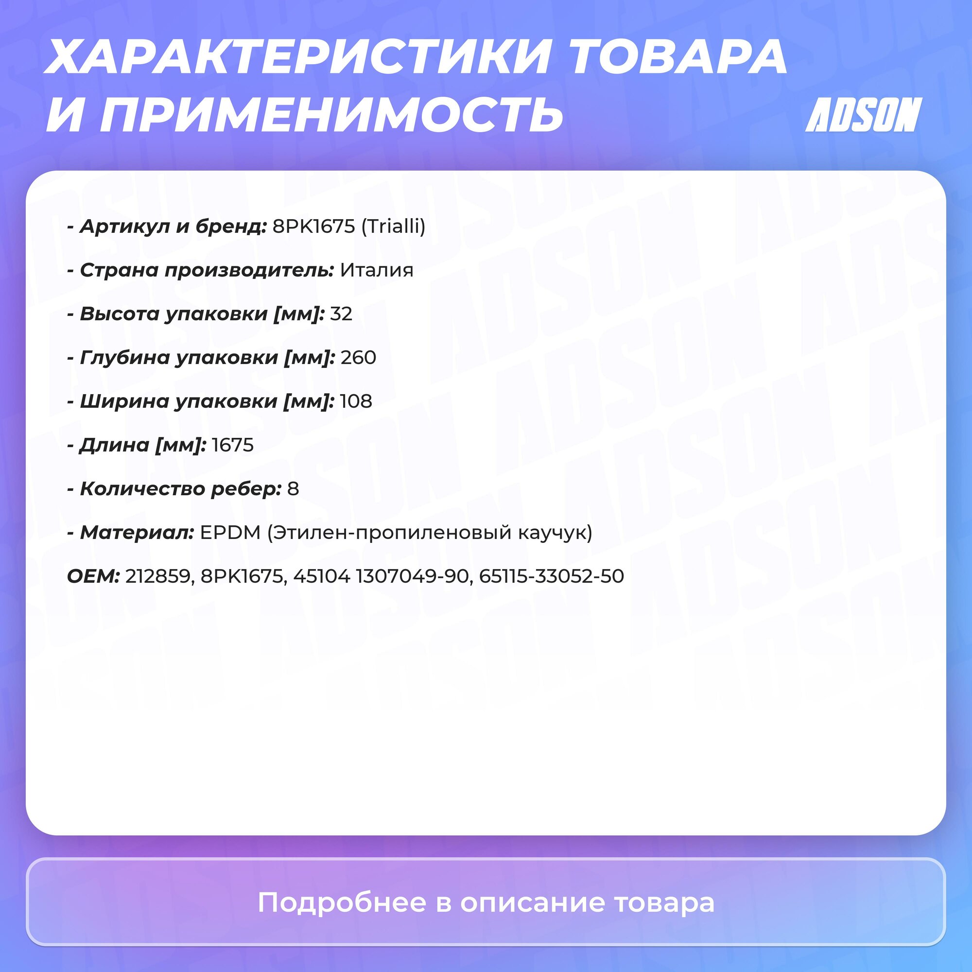 Внимание ! Цена указывается за 1 единицу товара!Вы Смотрите :Номер товара : 8PK1675 Производитель : TRIALLI Название товара : Ремень поликлиновой HCV Доступно для заказа : 2 Минимальное количество для заказа : 1 - заказывать кратно данному числу !Внимание!Делаем отправку заказа максимум через 2 дня после заказа, в зависимости от дня недели.Цена указана за 1шт, если указывается кол-во в лоте 10, то нужно заказывать 10шт, по 1шт данный товар не отправляемНапример:Cвечи продаются по 4шт(6,8,12) минимум и кратно 4шт(6,8,12)Втулки стабилизатора (которые одинаковые) по 2шт минимум и кратно 2шт, за исключением когда втулка идет на одну из сторон, то есть правая или левая!Пружины продаются по 2шт!