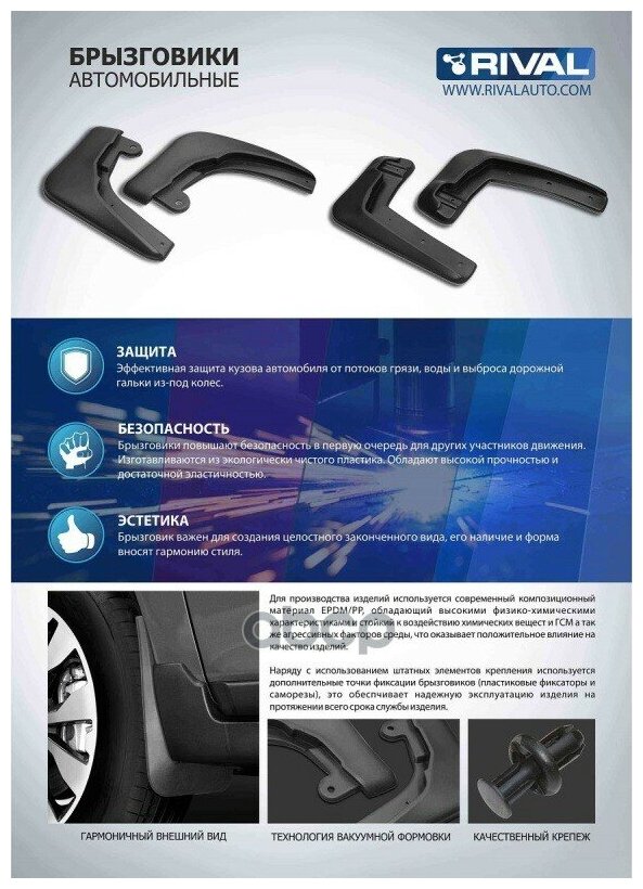 Брызговики Rival защищают покрытие автомобиля от грязи, мусора и посторонних предметов, летящих из-под колес вашего автомобиля во время движения.Особенности брызговиков Rival:- Изготовлены из высококачественного, нетоксичного и экологичного материала, что делает их стойкими к перепадам температур, а также придает эластичность.- Отлично вписываются во внешний облик автомобиля, выглядят как естественное продолжение колесной арки.- Надежно фиксируются в штатные технологические отверстия.