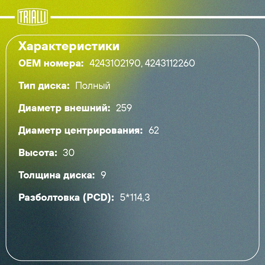 Бренд TRIALLI предлагает тормозные компоненты, соответствующие международным стандартам качества. Продукция проходит проверку на соответствие техническим требованиям и тестированиям на износостойкость, термостойкость и геометрическую точность. Тормозные диски производятся с соблюдением технологических норм, что обеспечивает их надёжную работу в различных условиях эксплуатации.