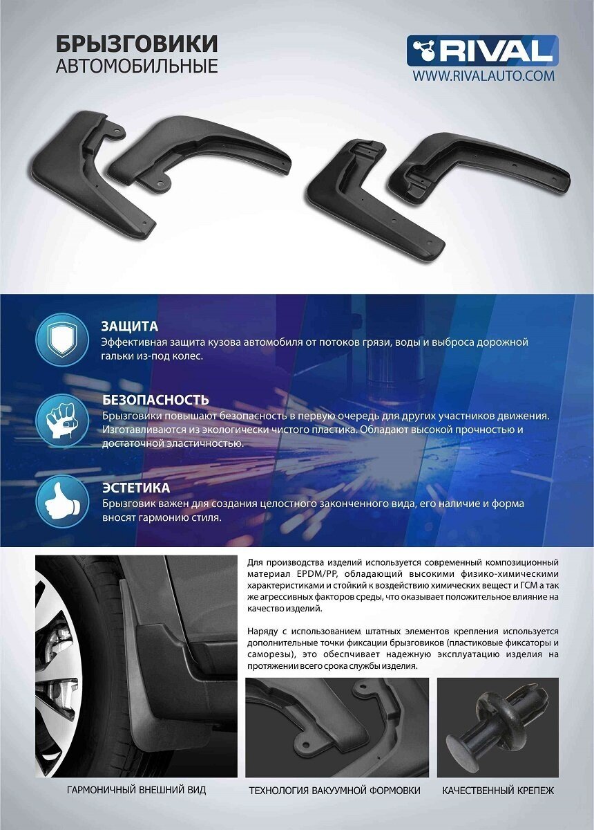 Брызговики Rival защищают покрытие автомобиля от грязи, мусора и посторонних предметов, летящих из-под колес вашего автомобиля во время движения.Особенности брызговиков Rival:- Изготовлены из высококачественного, нетоксичного и экологичного материала, что делает их стойкими к перепадам температур, а также придает эластичность.- Отлично вписываются во внешний облик автомобиля, выглядят как естественное продолжение колесной арки.- Надежно фиксируются в штатные технологические отверстия.