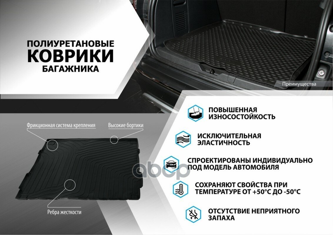 Коврик багажника позволяет надежно защитить и сохранить от грязи багажный отсек вашего автомобиля на протяжении всего срока эксплуатации, полностью повторяют геометрию багажника.Основными преимуществами продукта являются:- Борт, высотой 3 см, имеет специальную конструкцию, препятствующую попаданию разлившейся жидкости и грязи на внутреннюю отделку.- Произведены из первичных материалов, в результате чего отсутствует неприятный запах в салоне автомобиля.- Рисунок обеспечивает противоскользящую поверхность, благодаря которой перевозимые предметы не перекатываются в багажном отделении, а остаются на своих местах.- Высокая эластичность, можно беспрепятственно эксплуатировать при температуре от -50 до +60 градусов по Цельсию.- Изготовлены из высококачественного и экологичного материала, не подверженного воздействию кислот, щелочей и нефтепродуктов. Уважаемые клиенты! Обращаем ваше внимание, что коврики имеет форму соответствующую модели данного автомобиля. Фото служит для визуального восприятия товара.