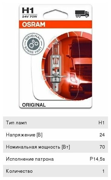 Галогенная лампа OSRAM ORIGINAL LINE H1 24V 70W 3200К Лампа OSRAM Original - H1-70 Вт-3200К, 1 шт.