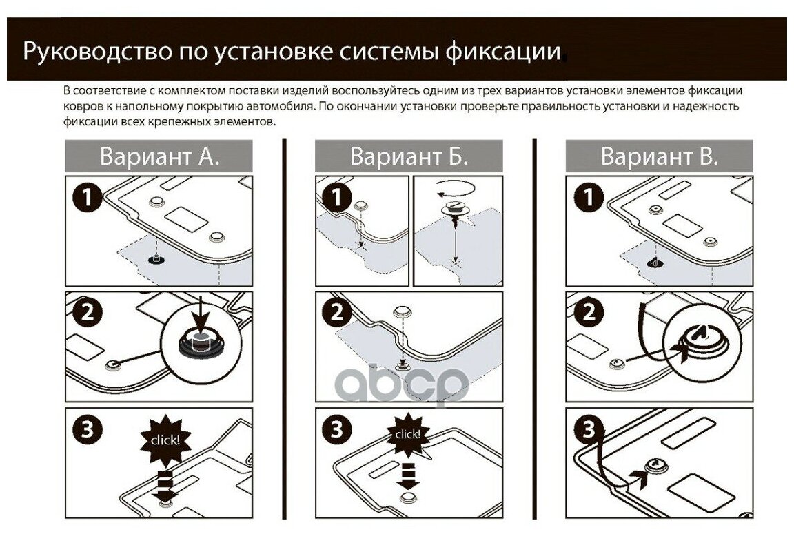 - Надежная система крепления, позволяющая закрепить коврик на штатные элементы фиксации, в результате чего отсутствует эффект скольжения по салону автомобиля.