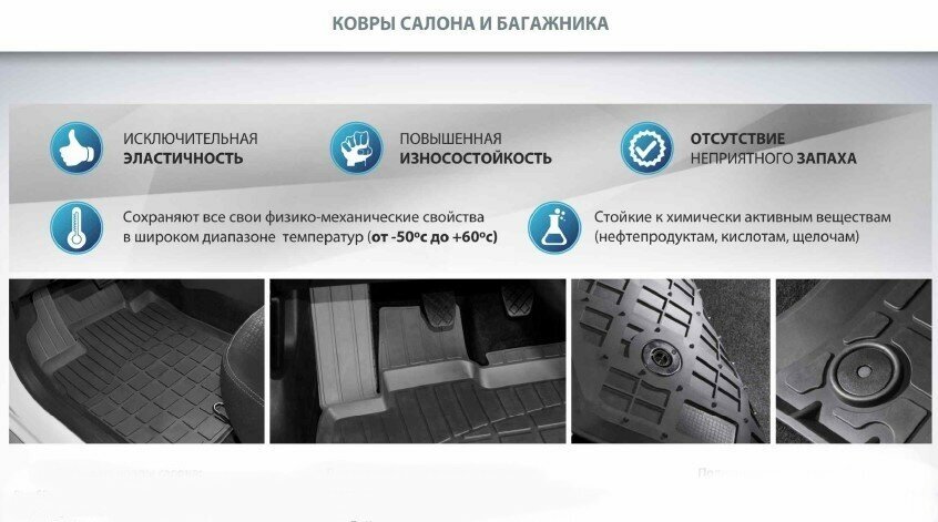 Коврик багажника позволяет надежно защитить и сохранить от грязи багажный отсек вашего автомобиля на протяжении всего срока эксплуатации, полностью повторяют геометрию багажника.Основными преимуществами продукта являются:- Борт, высотой 3 см, имеет специальную конструкцию, препятствующую попаданию разлившейся жидкости и грязи на внутреннюю отделку.- Произведены из первичных материалов, в результате чего отсутствует неприятный запах в салоне автомобиля.- Рисунок обеспечивает противоскользящую поверхность, благодаря которой перевозимые предметы не перекатываются в багажном отделении, а остаются на своих местах.- Высокая эластичность, можно беспрепятственно эксплуатировать при температуре от -50 до +60 градусов по Цельсию.- Изготовлены из высококачественного и экологичного материала, не подверженного воздействию кислот, щелочей и нефтепродуктов. Уважаемые клиенты! Обращаем ваше внимание, что коврики имеет форму соответствующую модели данного автомобиля. Фото служит для визуального восприятия товара.