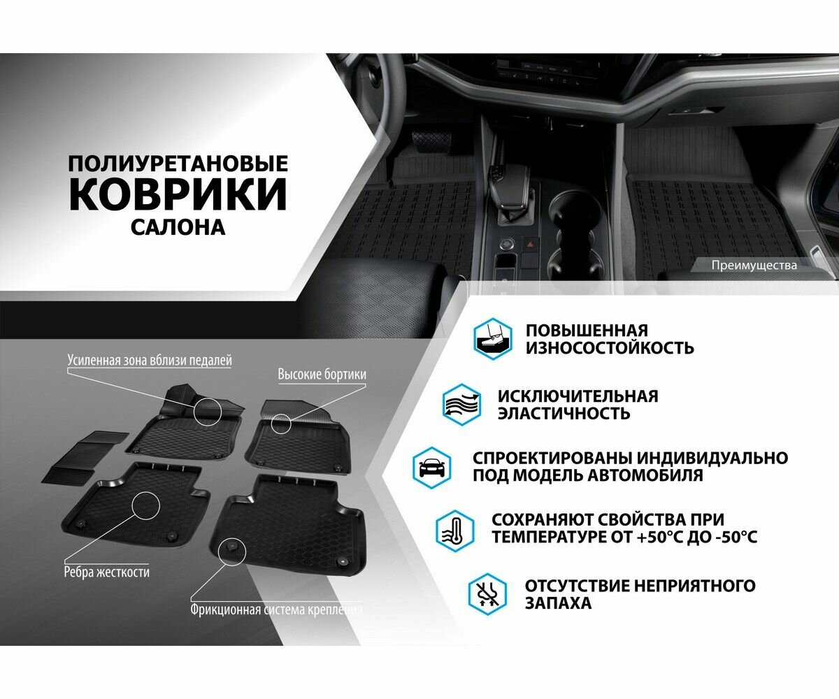 Комплектация крепежа:Фиксаторы к коврикам: передний левый - 2; передний правый - 2Прочные и долговечные ковры в салон автомобиля, изготовлены из высококачественного и экологичного сырья, полностью повторяют геометрию салона вашего автомобиля.Основными преимуществами продукта являются:- Надежная система крепления, позволяющая закрепить коврик на штатные элементы фиксации, в результате чего отсутствует эффект скольжения по салону автомобиля.- Высокая стойкость поверхности к стиранию.- Специализированный рисунок и высокий борт, препятствующие распространению грязи и жидкости по поверхности ковра. - Высота борта варьируется от 17 до 27 мм по периметру ковриков.- Перемычка задних ковров в комплекте предотвращает загрязнение тоннеля карданного вала.- Произведены из первичных материалов, в результате чего отсутствует неприятный запах в салоне автомобиля.- Высокая эластичность, можно беспрепятственно эксплуатировать при температуре от -50 до +60 градусов по Цельсию.Уважаемые клиенты! Обращаем ваше внимание, что коврики имеет форму соответствующую модели данного автомобиля. Фото служит для визуального восприятия товара.