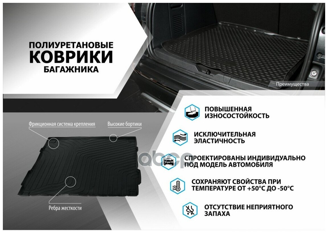 Коврик багажника позволяет надежно защитить и сохранить от грязи багажный отсек вашего автомобиля на протяжении всего срока эксплуатации, полностью повторяют геометрию багажника.