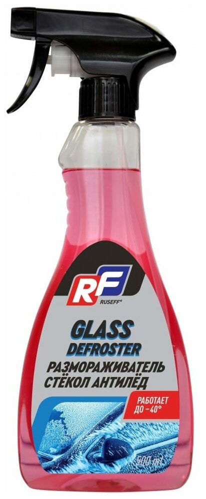 Размораживатель стекол RUSEFF эффективно растворяет и удаляет снег, лед и изморозь со стекол, фар, наружных зеркал, щеток «дворников» автомобиля, а также удаляет лед с форсунок стеклоомывателя. Средство работает при температуре до – 40°С, помогает предупредить обледенение, создает на обработанной поверхности пленку, предотвращающую образование ледяной корки.