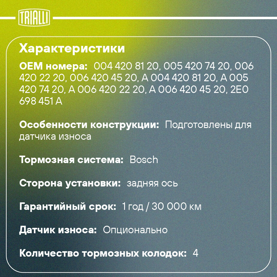 Колодки тормозные дисковые PF 1573 TRIALLI для MB Sprinter 509CDi-518CDi, VW Crafter 50 2.5TDi 06 — это надёжное решение для эффективного и безопасного торможения в любых дорожных условиях. Предназначены для замены изношенных тормозных колодок, обеспечивают стабильное прижатие к тормозному диску, минимизируя риск проскальзывания и сокращая тормозной путь. Основные преимущества тормозных дисковых колодок TRIALLI: Высокая износостойкость — увеличенный срок службы за счёт применения современных фрикционных материалов. Стабильная работа при перепадах температур — эффективное торможение как в городском цикле, так и на трассе. Низкий уровень шума и вибраций — специальное покрытие и демпфирующие пластины обеспечивают тихую и плавную работу. Минимальное образование пыли — сохраняет чистоту дисков. Быстрое приработочное торможение — достигается эффективное сцепление уже с первых километров после установки. Продукция TRIALLI разрабатывается с учётом международных стандартов безопасности и проходит многоэтапный контроль качества на всех стадиях производства. При производстве используются передовые технологии, что позволяет обеспечивать стабильные эксплуатационные характеристики даже в сложных климатических условиях. Для достижения максимальной эффективности рекомендуется заменять тормозные колодки TRIALLI парами на одной оси. Перед установкой убедитесь в отсутствии повреждений на тормозных дисках и при необходимости выполните их шлифовку или замену. После монтажа новых колодок соблюдайте режим приработки: избегайте резких торможений в первые 200–300 км, чтобы обеспечить равномерное прилегание фрикционного материала к диску. Регулярно проверяйте уровень тормозной жидкости и состояние направляющих суппортов для предотвращения закисания и неравномерного износа.