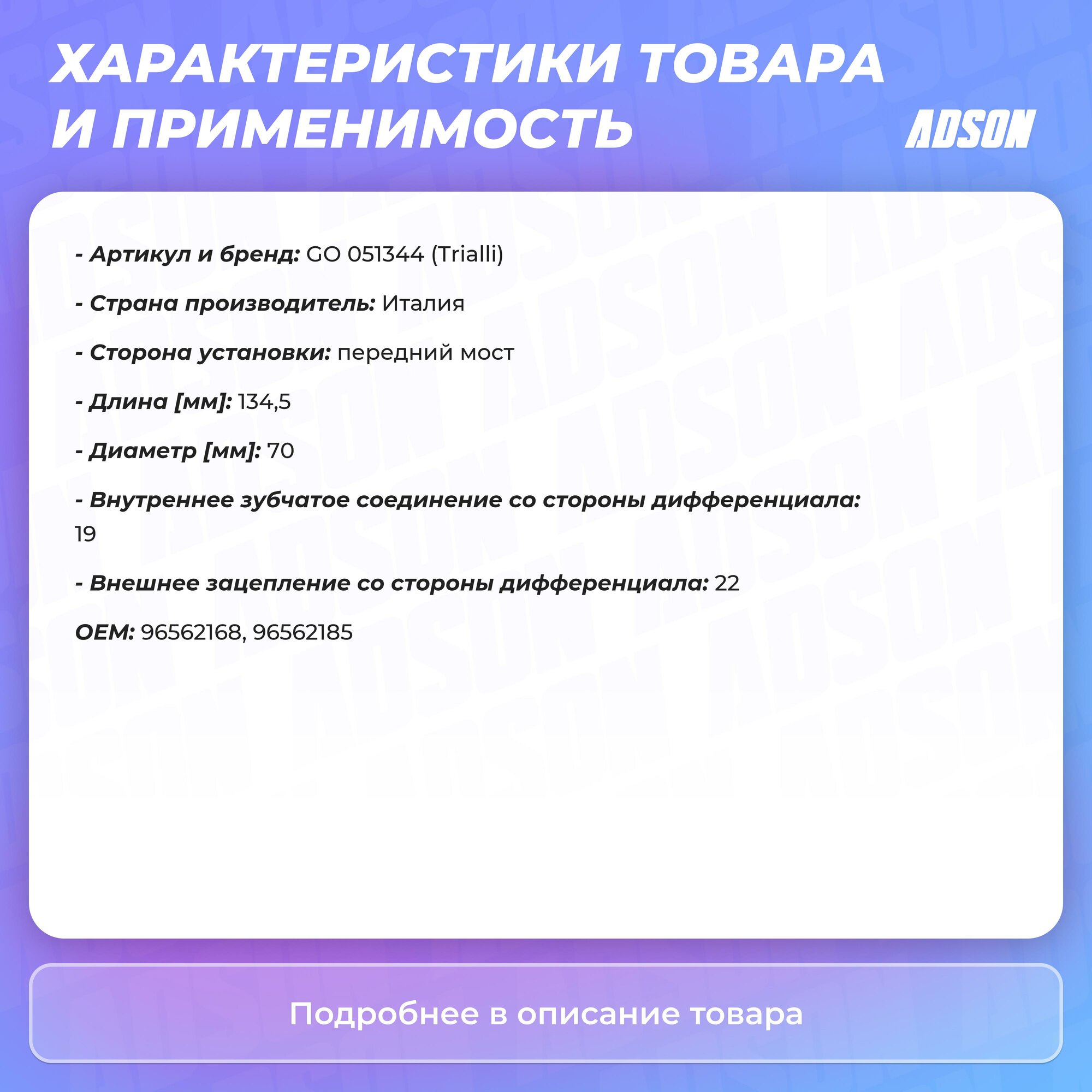Сервис сравнения цен СкидкаГИД предлагает сравнить цены на товар «ШРУС DAEWOO Matiz (98-) AT внутренний (TRIALLI) (GO 051344)»