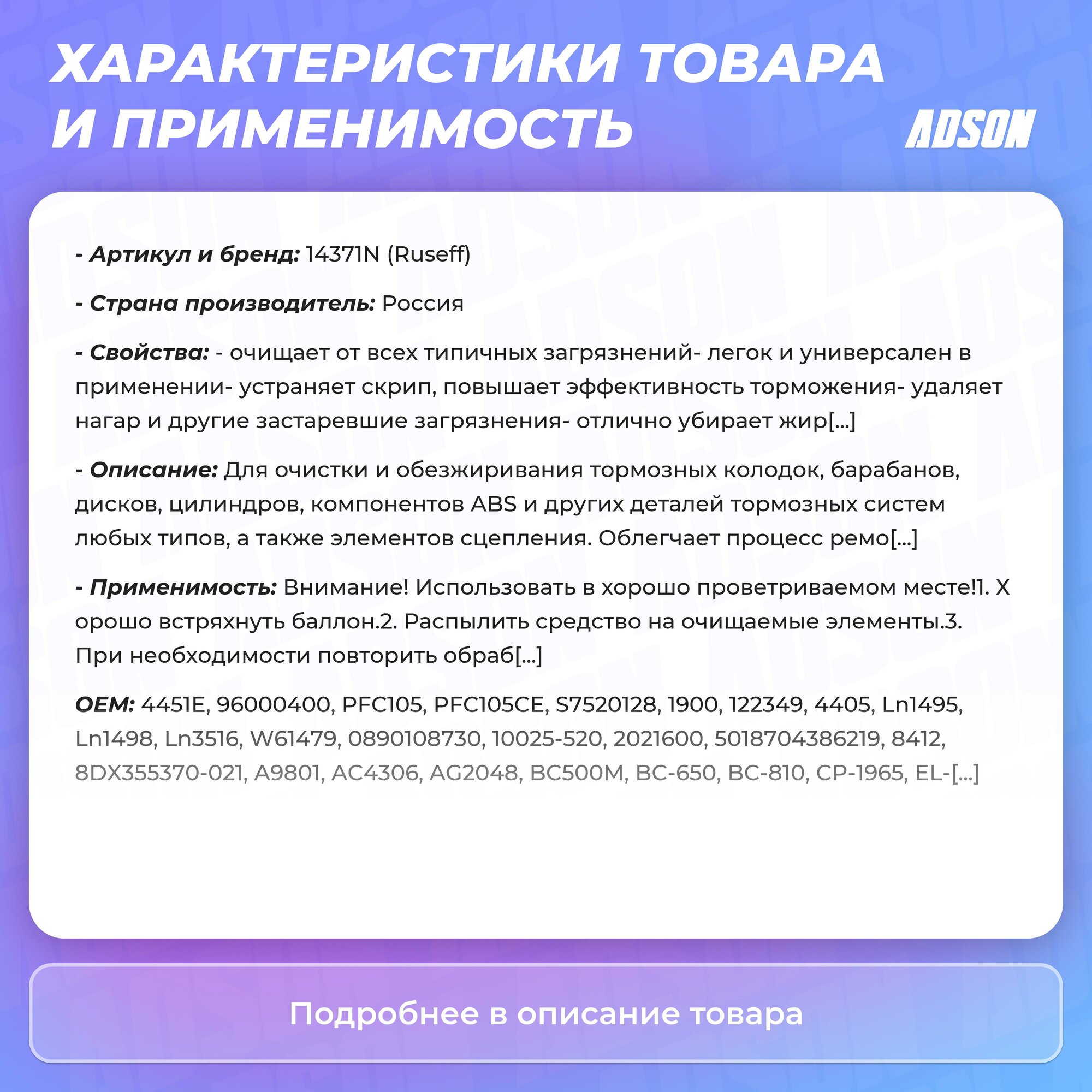 | Тип товара | Очиститель тормозной системы |