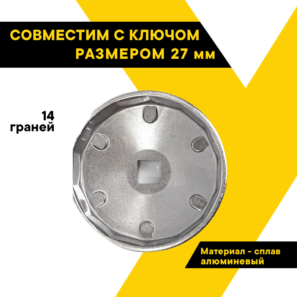 Применяется для снятия и установки масляных фильтров двигателей внутреннего сгорания.Изготовлен методом точного литья из алюминиевого сплава.Имеет стандартный внутренний присоединительный квадрат 1/2 (12.5 мм), что позволяет применять воротки и удлинители, а также производить установку фильтра с контролируемым моментом затяжки в полном соответствии техническим требованиях производителя автомобиля, используя динамометрический ключ.Может быть использован с гаечным ключом с размером рабочей части 27 мм.
