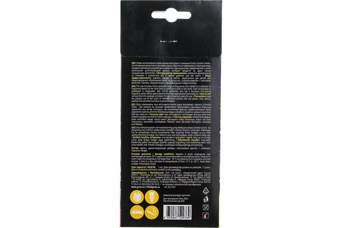 Эксклюзивная серия ароматизаторов от компании GRASS: Emotion Series - это коллекция ароматов по мотивам самых известных парфюмерных брендов мира. Каждая композиция разработана и подобрана совместно с профессиональными парфюмерами и имеет роскошный долгоиграющий аромат, который придется по душе самым искушенным ценителям.