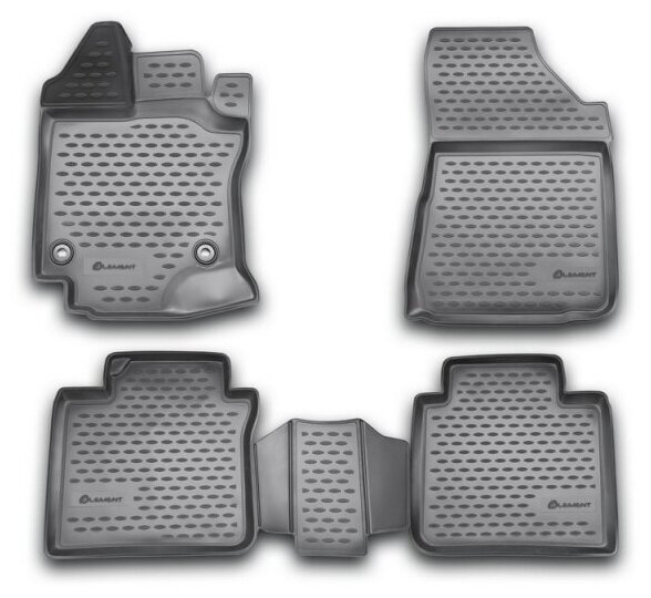 В поисках совершенной защиты пола автомобиля талантливые дизайнеры и инженеры создали уникальные ковры под брендом ELEMENT. Функциональность: идеально повторяют геометрию пола автомобиля; высокие борта обеспечивают надежную защиту интерьера от грязи и влаги; запатентованный 3D-язычок закрывает площадку отдыха ноги водителя, включая боковую поверхность; благодаря эластичности материала, ковры легко извлечь из автомобиля, не допуская попадания влаги и мелкого мусора на напольное покрытие салона. Безопасность: оригинальный крепеж надежно фиксирует водительский ковер в салоне, препятствуя попаданию ковра под педали управления. Ковры ELEMENT изготовлены с применением экологически чистых материалов, которые не оказывают негативного воздействия на человека. Дизайн: ковры имеют оригинальный объемный рисунок, который подчеркивает их индивидуальность, являясь продолжением дизайна автомобиля. Представлены в трех цветах: черном, сером и бежевом. Материал: полиуретан.