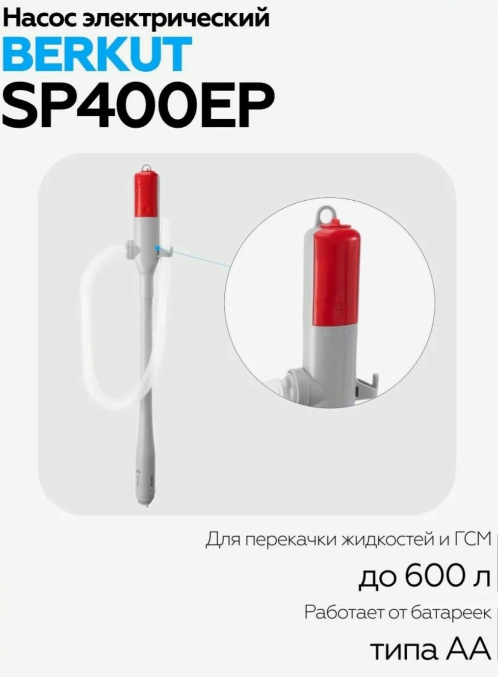 | Прочие особенности | Ручной насос для перекачки жидкостей и ГСМ BERKUT SMART POWER SP400ЕР специально адаптирован под канистры. Данная модель работает от двух батареек АА типа (приобретаются отдельно), напряжением 1.5 В каждая. С помощью них насос может перекачать до 600 л технической жидкости или топлива. Для удобства хранения в конструкции устройства предусмотрена проушина для подвеса, а также специальный держатель для рабочего шланга. |