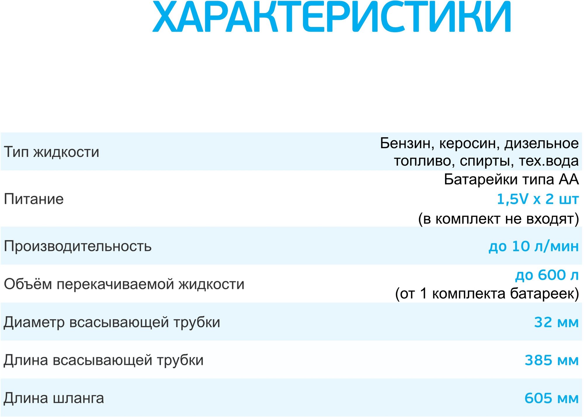 | Описание | Тип жидкостибензин, дизельное топливо, керосин, легкие масла, спирты, тех. вода. Питаниебатарейки типа АА 1,5V x 2 шт. Производительность10 л/мин. Объём перекачиваемой жидкостидо 600 литров (от 2-х батареек типа АА). Диаметр трубки32 мм. Длина трубки385 мм. Длина шланга605 мм. |