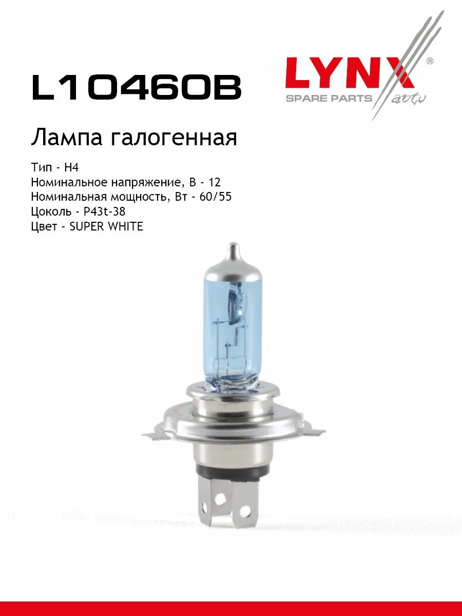 Галогенная лампа LYNXauto H4 12V 60/55W P43T-38 голубая (L10460B)