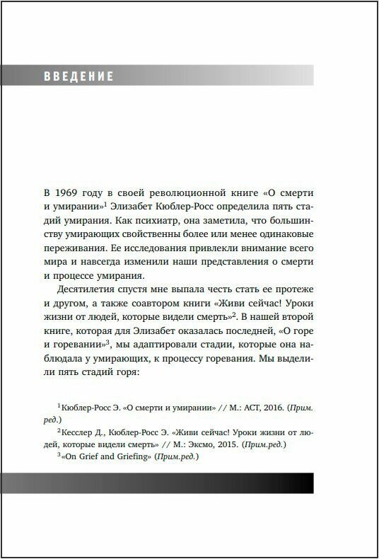 В классической модели Элизабет Кюблер-Росс существуют пять стадий горевания: отрицание, гнев, торг, депрессия и принятие. Поиск смысла — это шестая стадия, которую описал Дэвид Кесслер, доктор медицины и эксперт по вопросам смерти и скорби, а также друг и соратник Элизабет.