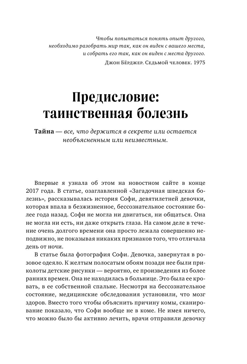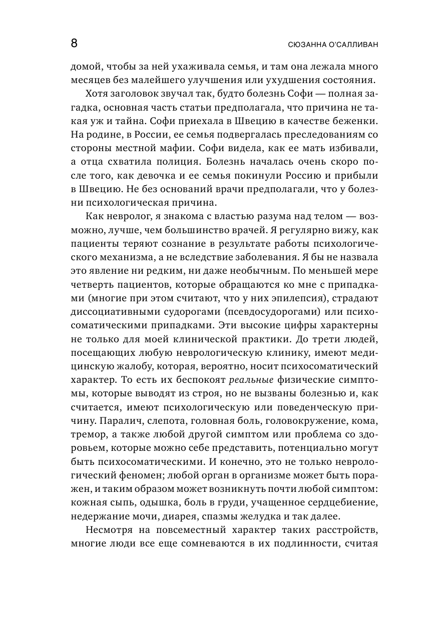 "Сюзанна О'Салливан раскрывает природу отражающих суть человеческого вида нарушений - функциональных неврологических расстройств. Механизмы развития этих состояний не только демонстрируют нам потрясающие способности человеческого мозга, но и раскрывают неотделимость социальных и культурных аспектов человеческого бытия от физического здоровья. Книга будет интересна и полезна широкому кругу читателей, и особенно врачам, неврологам и психиатрам". - Вероника Оранская, невролог, эпилептолог, врач клиники доказательной медицины Eviclinic и центра эпилептологии и неврологии им. А.А. Казаряна (Краснодар)