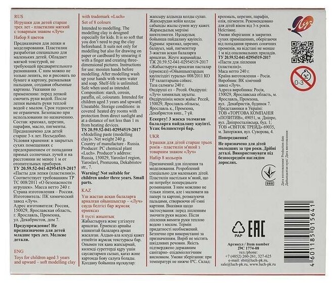 Набор пластилина упакован в картонную коробку и комплектуется пластиковым стеком (ножом) для лепки.