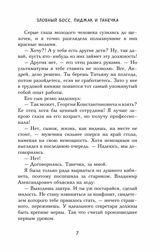 "Злобный босс, пиджак и Танечка" - незабываемый роман, от которого я была в полном восторге. Увлекательный сюжет и характерные герои делают книгу особенной. Больше всего мне понравился юмор, с которым написана книга. Я смеялась все время, пока читала. Книга поднимает настроение. Размер ее позволяет брать читать с собой в дорогу на работу. Очень довольна покупкой.