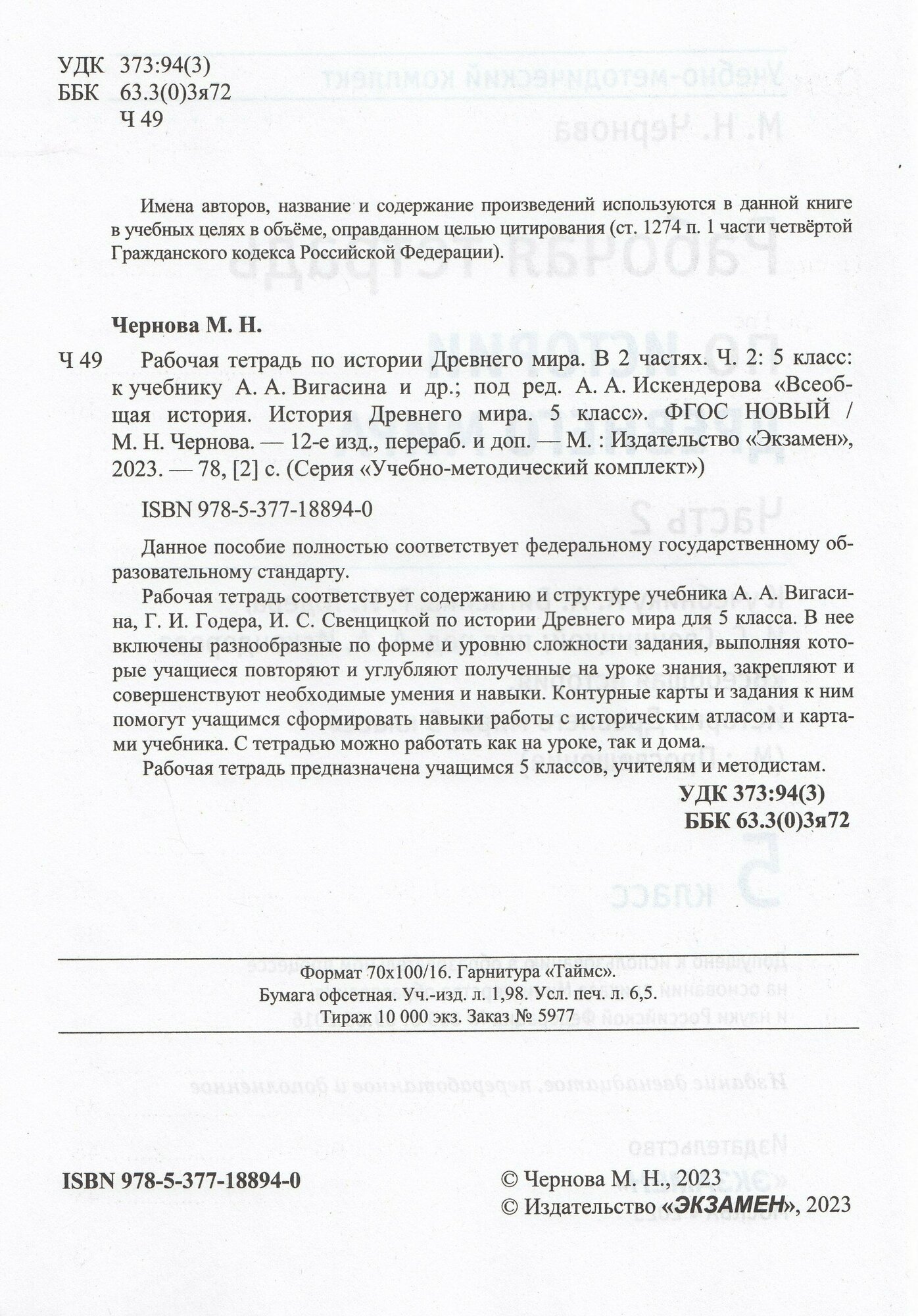 Рабочая тетрадь по истории Древнего мира 5 класс Часть 2 К учебнику А А Вигасина Г И Годера И С Свенцицкой под редакцией А А Искандерова Всеобщая история История Древнего мира 5 класс (Чернова Марина Николаевна); Экзамен, 2023